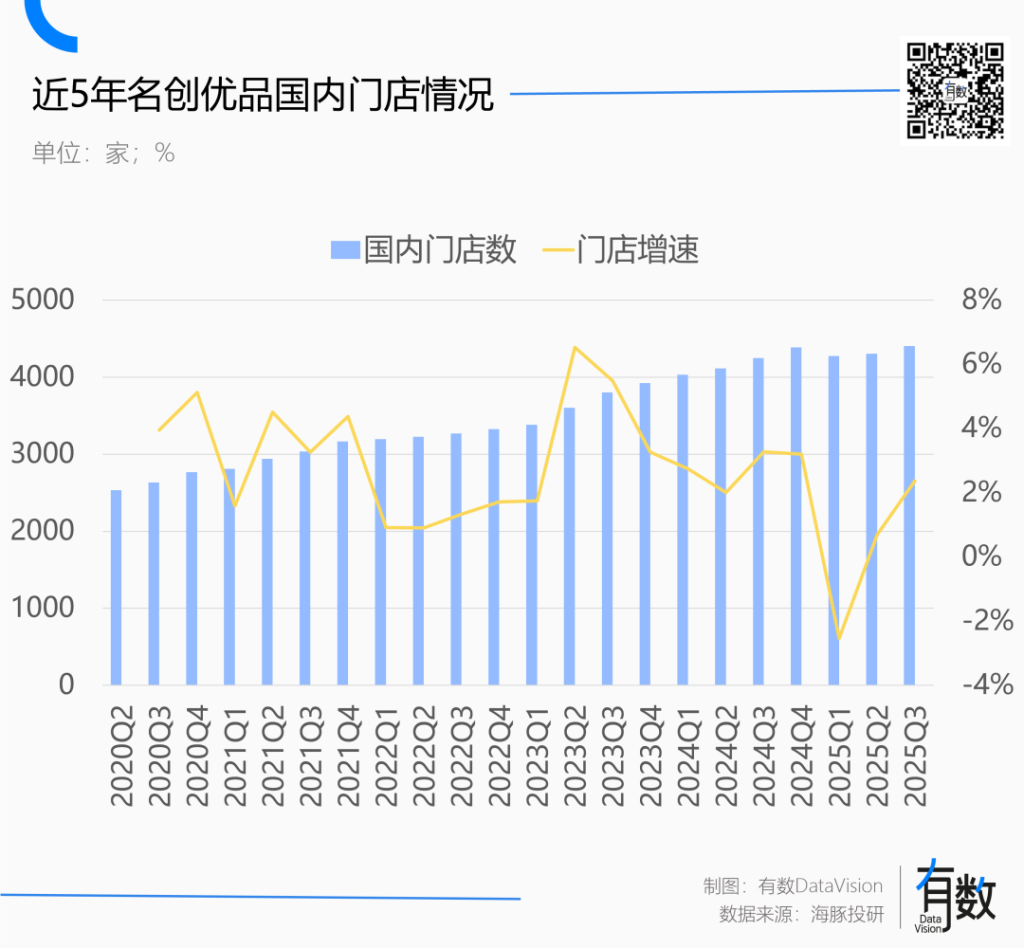 小商品、大客流、高周转的小店模式初现瓶颈。过去两年,除去2024年二季度,名创优品的国内营收增速在大部分时间里都落后门店规模增长。