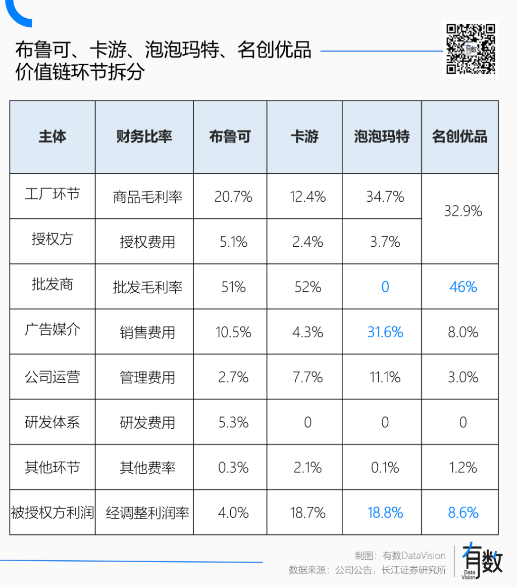 理论上,自有IP对应着高昂的运营支出与沉没成本,泡泡玛特的销售费用是名创优品的好几倍,但由于直营模式能够将大部分利润都留在自己的手里,一算利润率,反倒比开着加盟店卖授权毛绒的名创优品还高出一倍[11]。