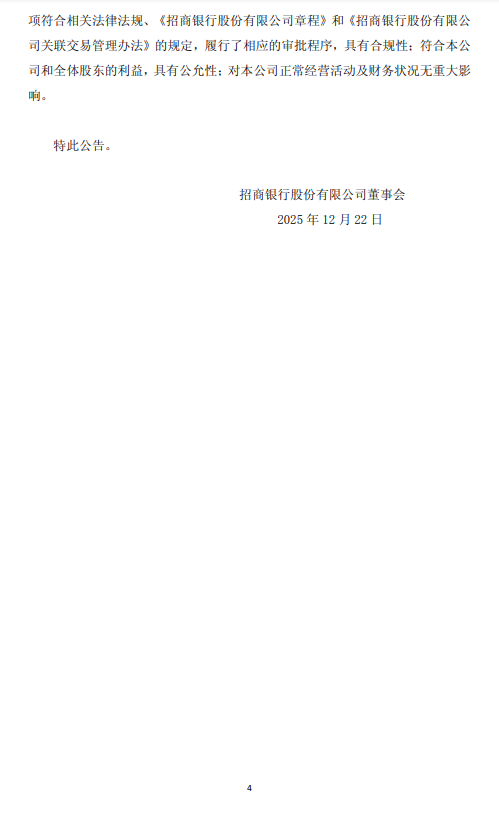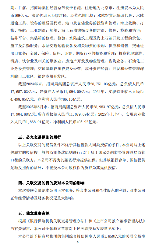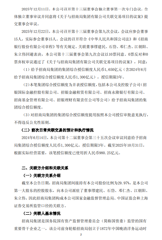 12月22日金融一线消息,公告称,12月22日召开的第十三届董事会第九次会议审议通过给予招商局集团1650亿元的集团综合授信额度(含2024年6月已授的1300亿元),授信期限3年,此为并表授信额度。截至2025年10月31日,2024年6月所授1300亿元额度已使用980.25亿元。招商局集团间接持股招行29.97%,是第一大股东的控股股东。该关联交易无需股东大会审议,对招行经营和财务无重大影响。
