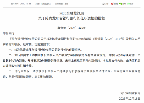12月23日金融一线消息,河北金融监管局发布批复,核准王耀发邢台银行股份有限公司行长的任职资格,核准陈青龙邢台银行股份有限公司副行长的任职资格,核准胡云泉邢台银行股份有限公司董事会秘书的任职资格。