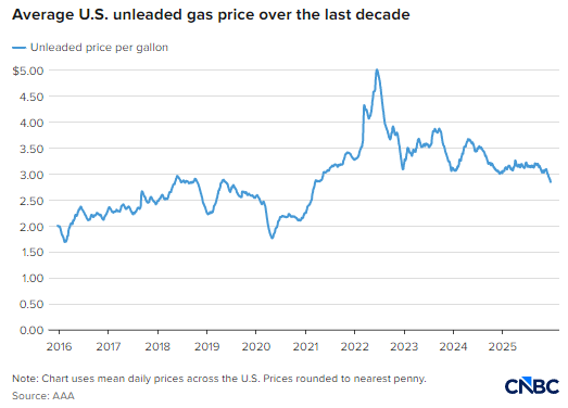 美国汽车协会发布的数据显示,本月绝大部分时间里,美国无铅汽油的均价都低于每加仑 3 美元,创下 2021 年以来的最低纪录。该协会表示,今年 12 月的汽油价格,将成为自 2020 年疫情之年以来,驾车民众加油成本最低的一个 12 月。