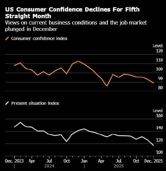经济学家原本预计,在创纪录的政府停摆结束后,消费者信心会有所回升。但报告显示消费者信心持续下滑,表明人们对通胀、关税以及政治局势仍然深切担忧。