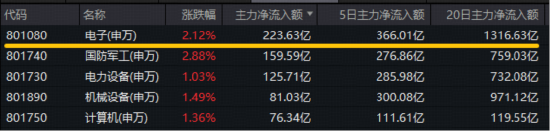 主力资金持续偏爱电子板块!数据显示,电子板块全天获主力资金净流入223亿元,近5日、近20日分别吸金366亿元、1316亿元,持续霸居31个申万一级行业首位!申万二级行业口径来看,消费电子板块获主力资金净流入超80亿元,位居所有行业TOP1。