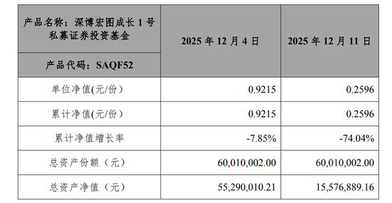 截至12月25日,基金最新单位净值为0.1846,累计净值增长率为-81.54%,亏损金额约4692万元,超过公司最近一个会计年度经审计净利润的10%。