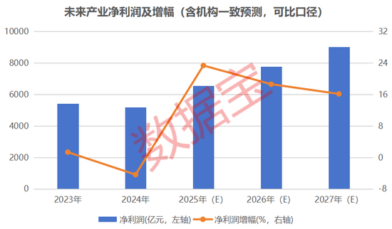 未来产业展现出了强大的增长动能。据证券时报数据宝统计,上文提及的7个未来产业共涉及381家公司,这些公司2023年、2024年净利润整体增幅(可比口径,下同)偏弱,且2024年净利润略有下降,结合机构一致预测的净利润中值来看,2025年这些公司整体净利润中值超过6500亿元(不含未获机构预测的公司),同比增幅有望超过20%,2026年、2027年整体净利润增幅均有望超过15%。