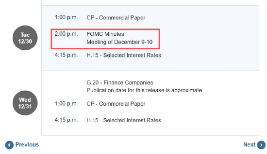 本周三3:00,美联储将公布12月货币政策会议纪要,这是本周最值得关注的热点事件。美联储12月11日公布了12月份的利率决议结果,宣布降息25基点,联邦基金利率下降至3.5~3.75%,符合市场预期。这是美联储年底第三次连续降息。数据公布当日,从开盘价99.21点暴跌至收盘价98.56点,次日延续暴跌走势。美联储降息的决定对行情面冲击明显。本次会议纪要发布,将再度挑动市场神经,可能导致美元指数继续走弱。上周是圣诞周,本周是元旦周,美联储官员和其他高官因为节日原因很少进行公开讲话。美联储会议纪要成为近两周唯一能够研判美联储货币政策走向的依据,其重要性不言而喻。