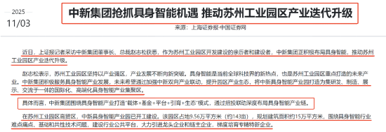 中新集团公司全称为中新苏州工业园区开发集团股份有限公司。近日,在接受媒体采访过程中,公司董事长、总裁赵志松公开表示,作为苏州工业园区开发建设的亲历者和建设者,公司正积极布局具身智能,推动苏州工业园区产业迭代升级。