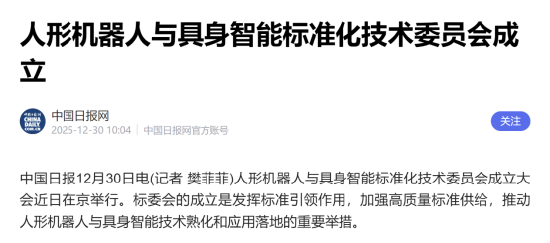 据介绍,成立人形机器人与具身智能标准化技术委员会是贯彻落实中央决策部署,发挥标准引领作用,加强高质量标准供给,推动人形机器人与具身智能技术熟化和应用落地的重要举措。标委会主要承担人形机器人与具身智能基础共性、关键技术、部组件、整机与系统、应用、安全等领域行业标准制修订工作。