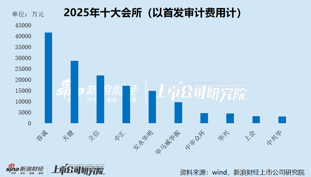 审计费排名前五的分别是容诚、天健、立信、中汇、安永华明,分别为4.17亿元、2.86亿元、2.19亿元、1.71亿元、1.49亿元。单个项目收费最高的是,审计机构为安永华明,IPO审计费为7577.12万元。