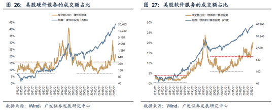 而科技大板块的成交额占比为41%(硬件21%、软件20%),也在历史中高位置,但距离1995-2000年的平均水平还有距离。