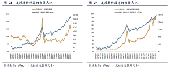 当前,美股科技大板块的市值占比为39%(硬件20%、软件19%),几乎在历史最高水平;