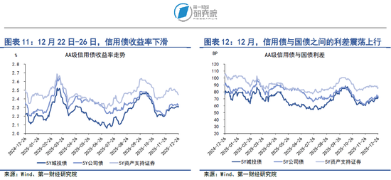在12月22日至12月26日当周,多数品种信用债收益率下降。在AAA级债券中,5年期城投债、公司债和资产支持证券收益率分别下降3.15BP、2.96BP和3.96BP。在AA级债券中,5年期城投债和公司债收益率分别上升1.27BP和0.16BP,资产支持证券收益率下降4.03BP。