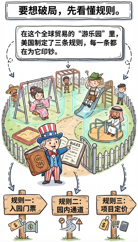 想象全球贸易是一个巨大的游乐园,美国制定了三条规则,每条规则都在帮它赚钱。