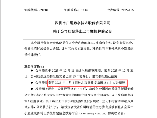 1月5日,广道数字(920680.BJ,退市整理期简称“广道退”)正式被北京证券交易所终止上市并摘牌。这是2026年的首只退市股,也是北交所设立以来,首例因重大违法被强制退市的上市公司。