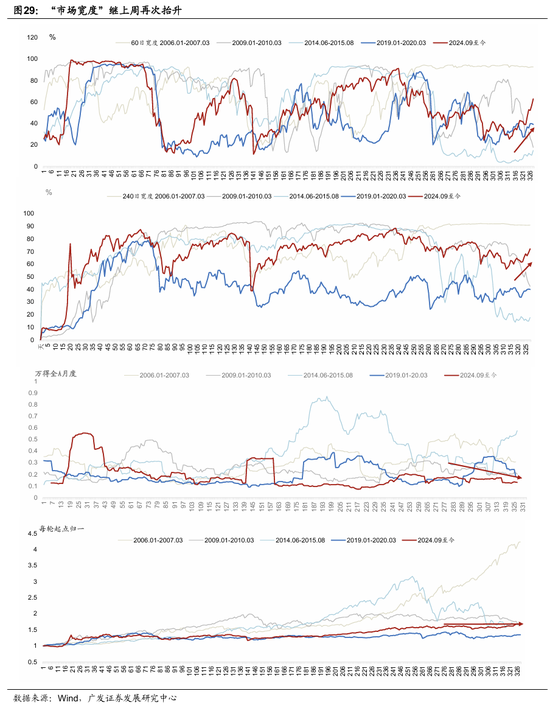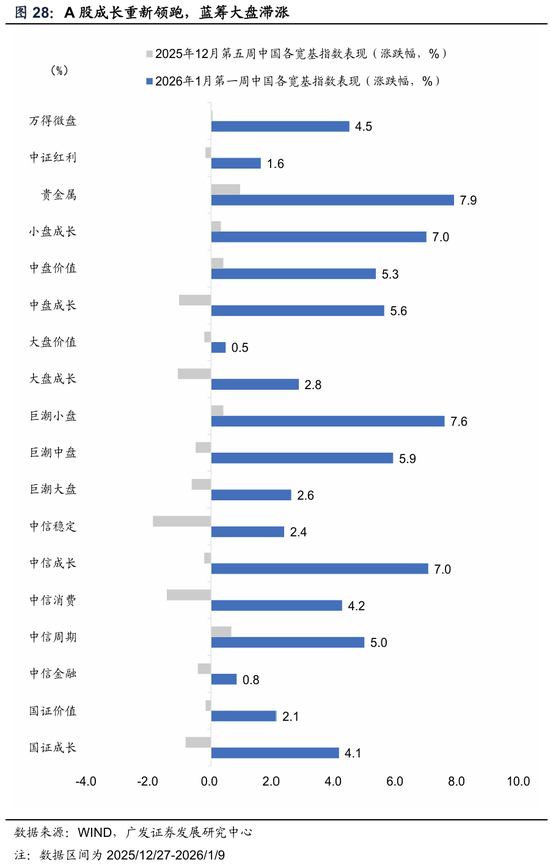 观察市场的广谱性。在“价”上,“市场宽度”大幅上升,万得全A指数成分股中各成分股超越股票自身240日均线的占比升至72.08%左右(上周为61.92%);超60日、20日均线占比升至82%、63%(上周为51%、39%)。在“量”上,市场集中度有所回落,A股成交额前5%的个股成交额占全部A股比重降至41.94%(上周为44.85%),降至到66.7%历史分位(上周为85.5%分位)。但由于市场上涨依赖于风偏情绪强劲,股市走强的同时,波动率明显回升,股债波动差仍维持高位。万得全A滚动1月的实际波动率(HV)升至13.3%(上周为11.7%)。股债年化波动率比值自上周的12.9倍抬升至13.1倍。全A估值偏离度上移,截至1月9日,万得全A市盈率收于23.22倍; “万得全A P/E-名义GDP增速”处于滚动五年的+1.97倍标准差(前两周稳定在+1.67倍、+1.68倍)。若名义增速未来升至5.0%,当前全A估值对应偏离度回归至+1.76倍标准差。历史+2倍标准差为估值约束的极致位。