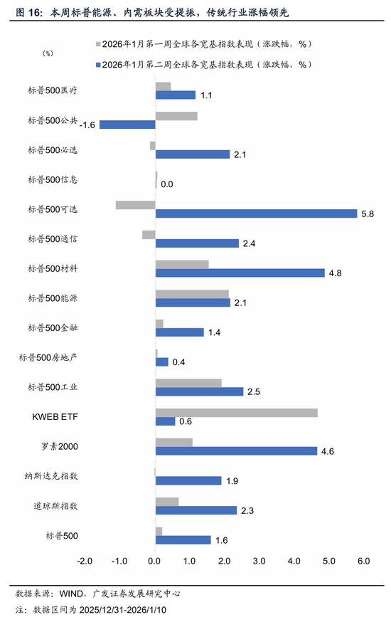 一是全球股市普涨,美股具备赔率优势的传统行业出现估值修复,宏观面尚可提供前置条件,科技巨头分化。欧日市场在“风偏稳定、无风险利率下行与事件驱动”中修复。我们编制的大类资产轮动指数上升,周均变动频次升至125次(上周为124次)。MSCI发达市场、新兴市场分别录得1.71%、1.91%。继上周回调后,美股三大指全线上涨,纳指、标普500、道指分别录得1.88%、1.57%、2.32%。其中,能源、内需板块受提振,传统行业涨幅领先。而在美债利率高位震荡中,市场对高估值AI巨头趋于审慎,核心源于美国就业市场形成新均衡特征,经济尚可支撑股市风偏,叠加政策红利(特朗普提议2027年国防预算增至1.5万亿美元且称将通过全球关税覆盖成本、美国“再工业化”战略叙事空间)、地缘风险带动油价、关键矿产加征关税预期。