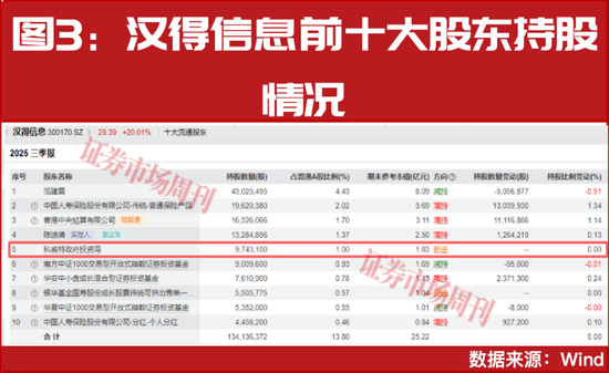 以汉得信息为例,2025年三季度末,公司前十大股东中7位来自机构产品,5位对公司的持仓进行了继续增持或新进重仓的增持操作,其中也包括了中东资金科威特政府投资局(见图3),其以974.31万股的持仓,新进成为了公司第五大股东。