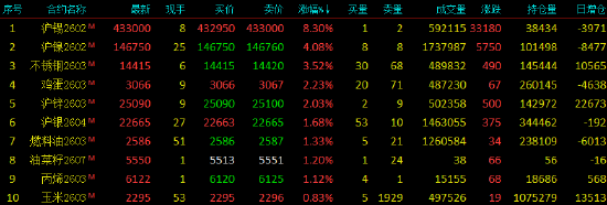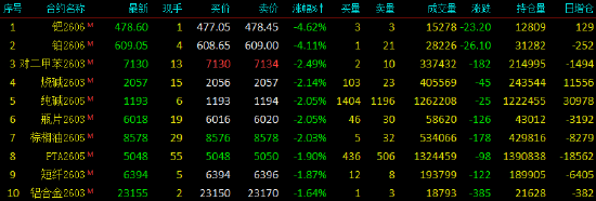 2026年1月15日,国内期货主力合约跌多涨少。涨超8%,涨超4%,(SS)涨超3%,、涨超2%;跌幅方面,钯、铂跌超4%,瓶片、、油、、跌超2%,、跌超1%。