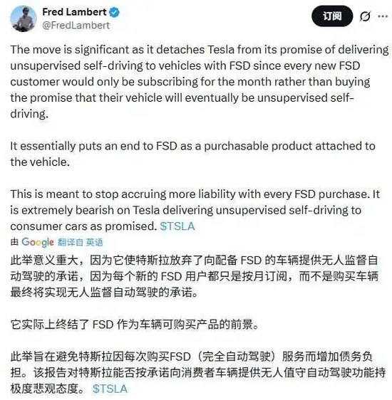 科技媒体Electrek的主编弗雷德兰伯特(Fred Lambert)就表示:“它使特斯拉放弃了向配备FSD的车辆提供无人监督自动驾驶的承诺”。