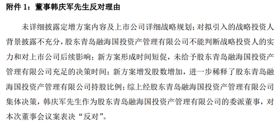 据公告披露,董事韩庆军提出反对的具体理由如下:未详细披露定增方案内容及上市公司详细战略规划;对拟引入的战略投资人背景披露不充分,股东青岛融海国投资产管理有限公司不能判断战略投资人的实力和对上市公司后续影响;新方案形成时间短促,未给予股东青岛融海国投资产管理有限公司充足的决策时间;新方案增发股数增加,进一步稀释了股东青岛融海国投资产管理有限公司持股比例;综上经股东青岛融海国投资产管理有限公司集体决策,韩庆军先生作为股东青岛融海国投资产管理有限公司的委派董事,对本次董事会议案表决“反对”。
