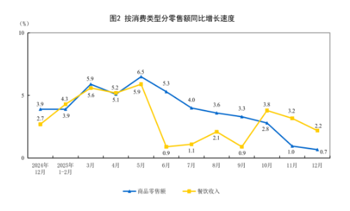 按消费类型分,12月份,商品零售额39398亿元,同比增长0.7%;餐饮收入5738亿元,增长2.2%。2025年,商品零售额443220亿元,比上年增长3.8%;餐饮收入57982亿元,增长3.2%。
