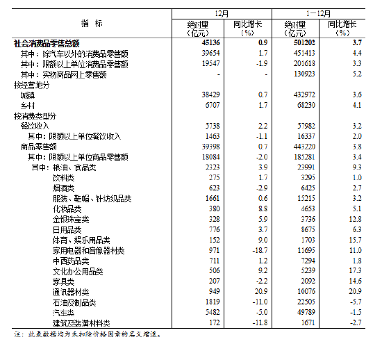 12月份,社会消费品零售总额45136亿元,同比增长0.9%。其中,除汽车以外的消费品零售额39654亿元,增长1.7%。2025年,社会消费品零售总额501202亿元,比上年增长3.7%。其中,除汽车以外的消费品零售额451413亿元,增长4.4%。
