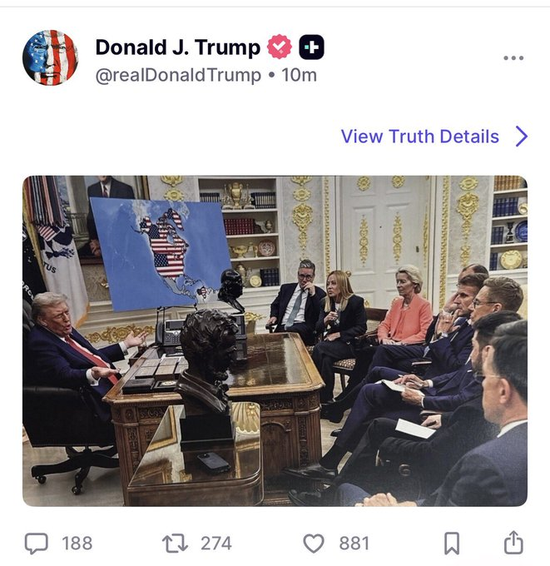 特朗普当天还发布了另一张图片:他在白宫办公室与欧洲领导人会面,后面展板上的地图中,除美国本土外,加拿大、格陵兰岛和委内瑞拉均被美国国旗覆盖。
