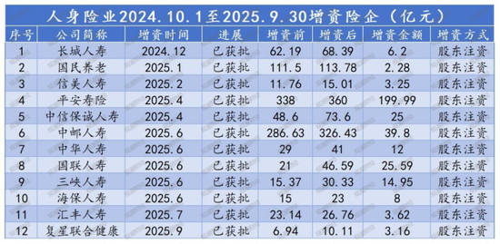 值得一提的是,上述险企中,国联人寿、三峡人寿、海保人寿、中华人寿、复星联合健康、中邮人寿、平安寿险等7家险企均在2025年获批增资。