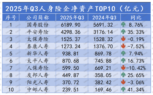 具体来看,2025年Q3,国寿股份净资产同比上升8.76%,突破六千亿元;平安人寿净资产突破四千亿元,同比增长35.33%;太保寿险、泰康人寿净资产则同比下降,分别为1525.37亿元、1273.24亿元。