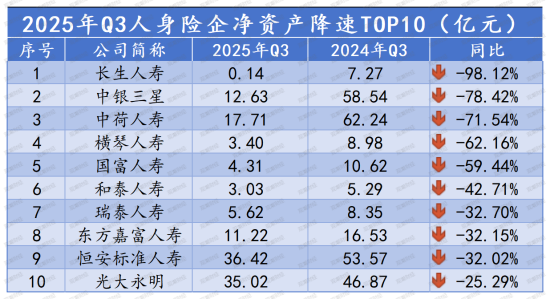 经观潮财经统计分析发现,2025年Q3净资产负增长TOP10险企中,大多数为中小型合资险企,其部分或与切换新会计准则有关,例如中银三星人寿、国富人寿。