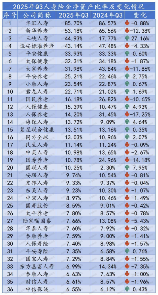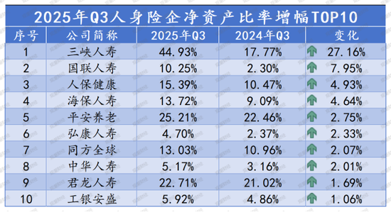 其中,三峡人寿净资产比率增长最快,2025年Q3净资产比率为44.93%,较2024年Q3增加了27.16个百分点。其余险企变化均未超10%。