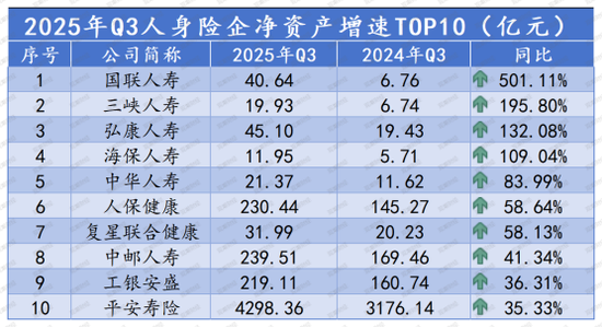 具体来看,增速TOP10多为小基数险企,共占6席。其中,国联人寿净资产增速最高,2025年三季度达40.64亿元,增长超5倍;其次为三峡人寿,同比上升195.81%,达19.93亿元。