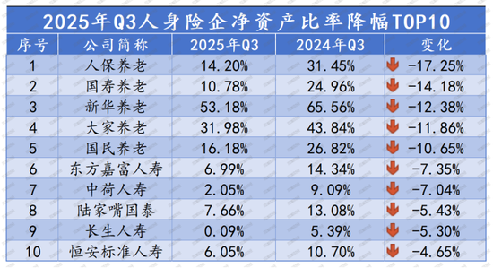 与2024年Q3相比,2025年Q3净资产比率下降TOP10的险企中,养老保险公司占据前五。这或意味着,虽然养老保险公司净资产比率基数较高,但正因业务扩张持续消耗中。