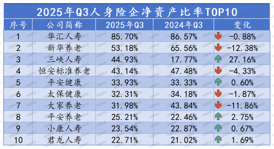 从2025年Q3净资产比率排名前十来看,有4家寿险公司、4家养老保险公司、2家健康险公司,这与不同类别险企业务结构有关。