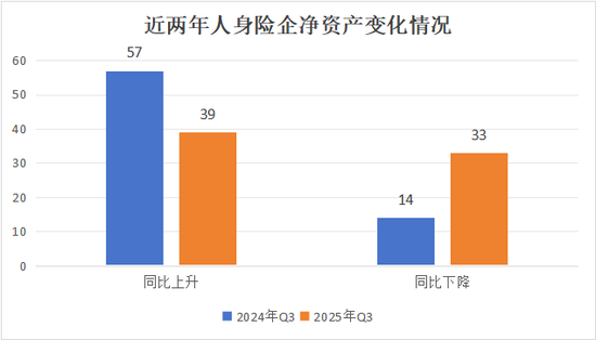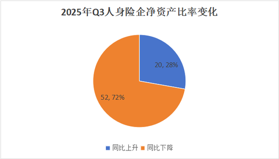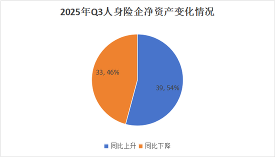 已公布2025年Q3净资产的72家人身险企中,54%险企实现净资产正增长,而46%的公司出现同比下降,这与2024年同期数据相去甚远。