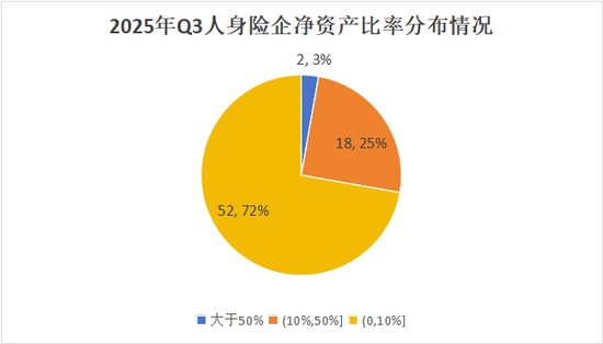 具体到公司层面,72家人身险企中28%险企的净资产比率超过10%,72%险企未达此数。