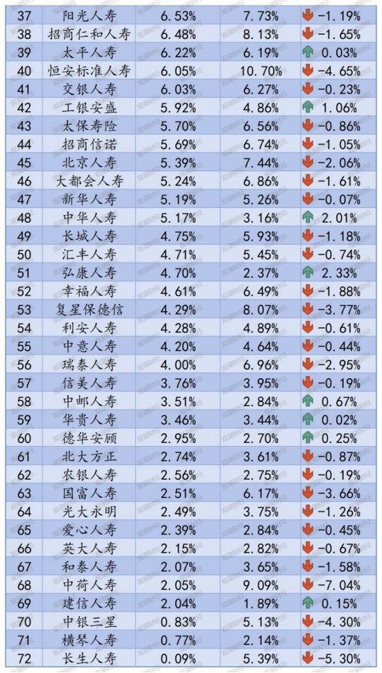 其中,中银三星人寿、中荷人寿、横琴人寿、国富人寿降幅均超50%。