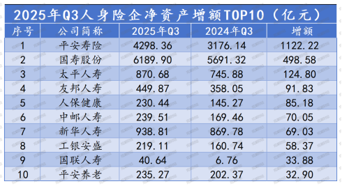 净资产增额TOP10:平安、国寿、太平3头部险企超百亿