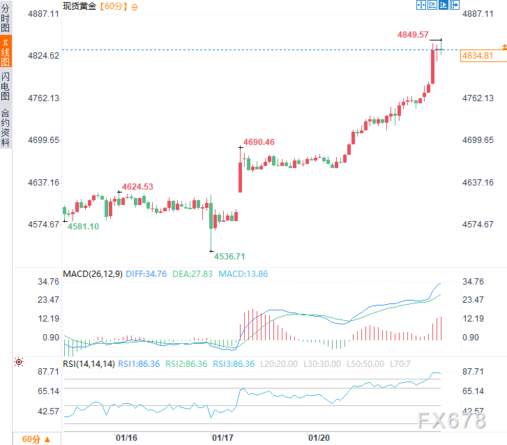 格陵兰岛危机正从一场地缘政治博弈,演变为对全球金融体系的核心冲击。市场正以罕见的“股债汇三杀”方式“抛售美国”,反映出投资者对将经济工具武器化及美国政策可预测性的深度信任危机。避险黄金飙升屡次刷新历史新高,揭示了这场动荡的本质:资本正在逃离政治风险,寻找不受主权信用影响的终极避风港。这不仅仅是战术性避险,更可能是结构性资本外流的开端。周三(1月21日)亚市时段,现货黄金震荡上涨,现交投于每盎司4830美元附近,日内涨幅约1.4%,截至11:15,现货黄金曾一度创下4849.57美元/盎司的历史高点。