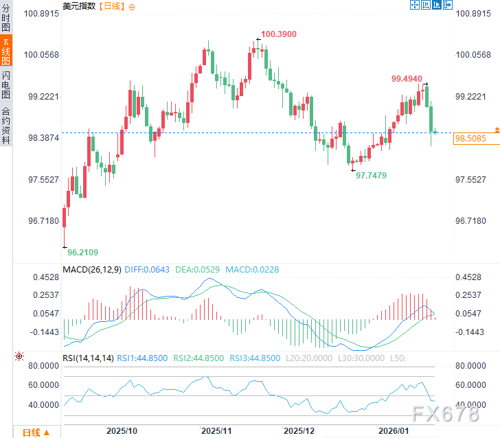 周三于98.60附近窄幅震荡,此前两个交易日美元指数显著下跌,跌幅约1%。