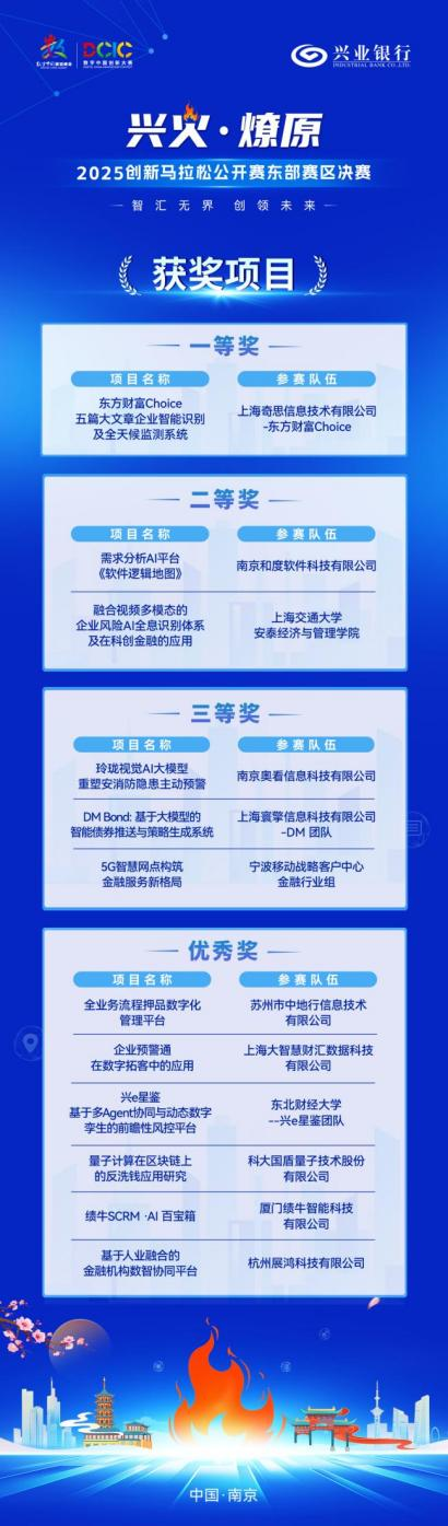 此次2025年“兴火燎原”创新马拉松公开赛东部赛区决赛的成功举办,是兴业银行南京分行积极践行创新驱动发展战略、主动融入金融强国建设的生动实践,更是立足南京、辐射区域,以金融力量赋能地方创新发展的有力举措。未来,兴业银行南京分行将以本次大赛为契机,持续深耕创新赛道,深化多方协同合作,全力推动大赛成果落地生根,以更优质的金融服务、更开放的合作姿态,为区域经济高质量发展、为“科技—产业—金融”良性循环贡献更多兴业力量!