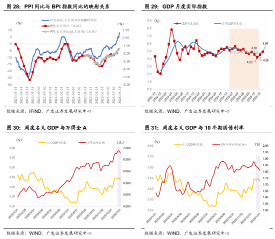 第四,高频模型显示1月最后一周实际端能见度下降,价格端继续改善。大宗金属巨震但能源稳定,CPI在猪、油共振中新涨价回升,基数压力最大时段正在度过。由于春节错位,生产环比回落但同比不差。预计1月实际、名义GDP分别为4.94%、4.48%(2025年12月经回溯调整后为4.55%、4.30%)。