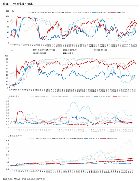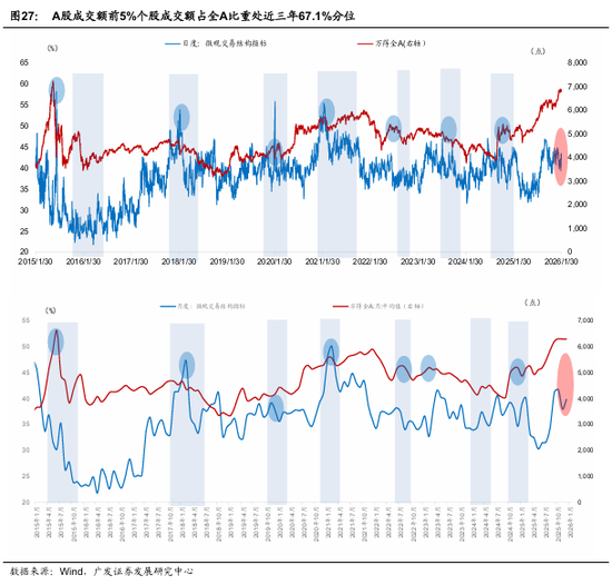 全A估值偏离度暂缓上行,估值“天花板”发挥定价影响。截至1月30日,万得全A市盈率收于23.34倍;“万得全A P/E-名义GDP增速”处于滚动五年的+2.0倍标准差(前两周为+2.01倍、+1.98倍)。若名义增速未来升至5.0%~5.5%之间,当前全A估值对应偏离度回归至+1.87倍、+1.71倍标准差。历史+2倍标准差为估值约束的极致位。总量“降温”延续,市场放量下跌,市场宽度大幅下降,集中度提升,轮动速度大幅抬升,波动进一步攀升,股债波动比再度拉大。
