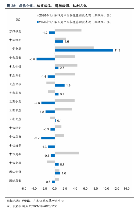 同样考虑到今年春节效应错位,预计1月社零同比小幅升至1.44%,服务业生产指数为5.21%。乘用车销量数据无明显变化,1月1-18日,全国乘用车市场零售67.9万辆,同比降幅约30%。地产在春节错位下,30城新房销售周同比上行但信号意义有限,1月全月仍同比为-21.49%,仅较2025年11-12月-33.06%、-26.61%同比降幅收窄。周环比小幅正增,成交面积日均值自16.97万平方米升至20.97万平方米。出行处于季节性中枢附近,十大城市客运量同比维持正增、百城拥堵状况则同比回落。