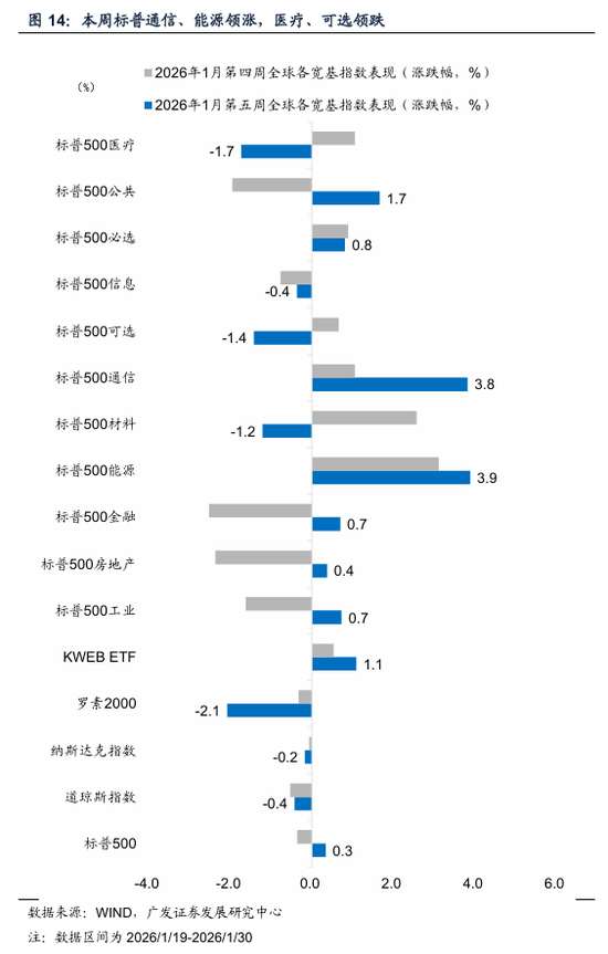 一是全球股市双边震荡。美股聚焦财报与估值定价,欧日聚焦国内政策与外围关税定价。金银叙事松动小幅波及美股。我们编制的大类资产轮动指数周均变动频次至123次(上周为118次)。MSCI发达市场涨跌收平(0.04%)、新兴市场小幅上涨1.38%。美股三大指走势分化,盈利报告与科技股自身赔率仍主导定价,美联储主席提名事件冲击影响温和。标普先扬后抑、全周涨0.34%,纳指冲高回落、收跌0.17%,道指回落0.42%。标普500波动率大幅上升,VIX收于17.44%;VVIX收于108.18。股市情绪趋于审慎,但未明显Risk off,标普500恐贪指数跌至恐惧区间-49.3(上周为50)。标普行业中,受益于原油上涨的能源(3.9%)与因Meta Platforms大涨拉动的通信(3.8%)板块领涨,医疗(-1.7%)、可选(-1.4%)板块领跌,材料板块因周五金银回调而下跌明显。罗素2000指数(小盘股)下跌2.1%,在宽基中最为落后。科技股内部分化仍明显,META、苹果领涨,分别录得8.76%、4.61%,拉动美股科技七姐妹指数上涨0.88%,费城半导体指数因美光科技等存储板块带动,而上涨0.51%。