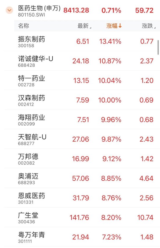 早盘,医药生物板块走强。中药、创新药方向表现活跃。截至午间收盘,涨超10%,特一药业、汉森制药等涨停。