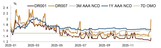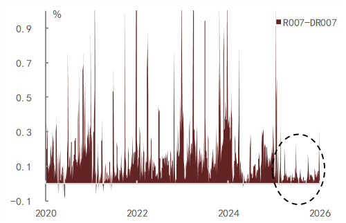 2025年货币市场呈现几大运行特征。一是,伴随资金面逐步转松,资金利率与政策利率间利差逐步收敛,多数时间内,7天逆回购利率成为了DR007加权利率的隐性下限,DR001利率则维持在央行临时隔夜正、逆回购利率区间内波动。二是,央行精细化投放下,资金利率波动降低,尤其是在月中缴税缴款、及跨月/季等季节性时点。三是伴随资金面逐步转松,资金分层现象有所减弱。