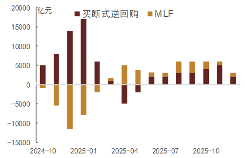 2025年央行延续“实施适度宽松的货币政策”的定调,继续灵活运用降准降息等工具保持流动性充裕,加强逆周期调节。实施力度上,2025年央行货币政策总量放松集中在上半年,5月央行推行一揽子货币政策措施,使得流动性快速回归宽松,下半年更多转向依靠公开市场调节狭义流动性,尤其是MLF、买断式逆回购等中长期流动性净投放规模抬升,并辅以结构性工具“精准滴灌”。从中长期流动性投放情况来看,前半年投放波动性较大,买断式逆回购投放规模普遍高于MLF,后半年在资金面整体平稳宽松后,买断式逆回购和MLF均维持每月净投放,投放规模基本均衡,与此同时7天逆回购净投放力度整体减弱,反映金融机构对流动性的主动需求有所减弱。