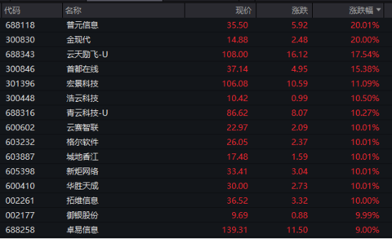 计算机板块逆势上行,板块涨幅接近2%,板块内个股掀起涨停潮。、均“20cm”涨停,、、、、、、等股票纷纷涨停,另有多股盘中涨幅超过10%。