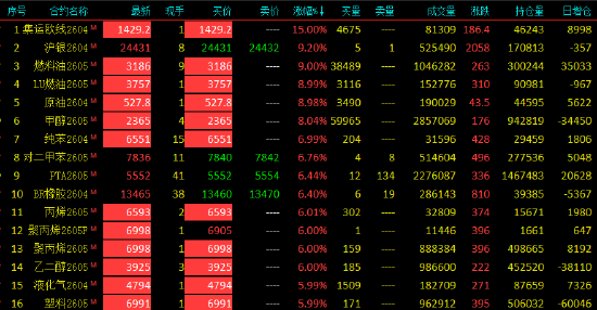 2026年3月2日,国内期货主力合约大面积飘红,集运欧线、燃油、低硫(LU)、SC、、纯苯、丙烯、聚丙烯、(LPG)、(EG)均触及涨停,沪银涨超9%,0>(PX)、、涨超6%。跌幅方面,多晶硅跌超2%,跌近2%。